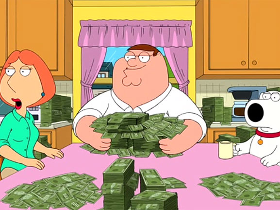 Peter acquista 200.000 biglietti della lotteria ipotecando la casa per chiudere tutti i debiti familiari e vince 150 milioni di dollari! La sua scialacqueria lo porta a bruciare tutto il denaro in poco meno di un mese rovinando l'amicizia con Quagmire e Joe....