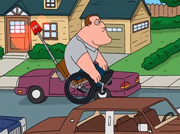 La famiglia Griffin e il vicinato si adoperano per ottenere il denaro necessario a far operare un ragazzo con il polmone di acciaio. Raggiunta la cifra, un malvivente sottrae loro il denaro e viene "rincorso" da Joe Swanson che riesce a recuperare la refurtiva ma non a catturare il ladro. Disperato per il mancato arresto decide di lasciare la polizia. Peter, in cuor suo preoccupato per l'amico, lo convince a iscriversi alle olimpiadi per i portatori di handicap. Qui Joe sembra ritrovare lo smalto perduto ma soltanto un piccolo "aiuto chimico" somministrato a sua insaputa da Peter gli permette di primeggiare nelle discipline. Joe diventa l'idolo del paese, viene girato un film su di lui e viene scelto come testimonial pubblicitario di cereali per la colazione. Peter, non sentendosi riconosciuto il merito, decide di rivelare l'uso di steroidi da parte di Joe durante le gare. I due riescono a riappacificarsi e Joe a ritornare nella polizia grazie all'arresto di un criminale ben conosciuto! |