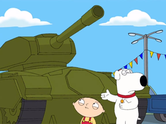 Meg ha bisogno di un'automobile per poter girare indisturbata e non chiedere più ai suoi di portarla in giro e così la famiglia Griffin si reca in una concessionaria con l'intento di soddisfare il desiderio della figlia, ma Peter, idiota come al solito, compra un carrarmato invece di una macchina! Intanto a Quahog è stato aperto un Megastore che succhia risorse e lavoro a tutta la cittadina: persino l'energia elettrica diventa esclusiva della super-struttura commerciale. Meg e Peter finiscono per trovare lavoro proprio lì ma la cittadina non può andare avanti, urge trovare una cura immediata....e sarà proprio il carrarmato acquistato dal ciccione a risolvere il problema... |