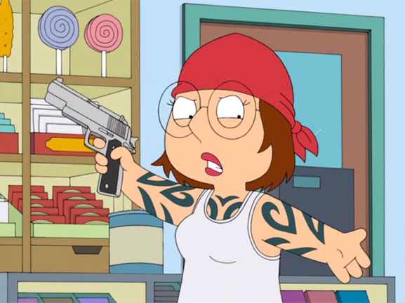 Brian pedina Meg per scrivere un articolo sui teenager di oggi e scopre che si vede con un galeotto in carcere! Spiffera tutto ai genitori che le proibiscono di incontrarlo di nuovo....inutilmente... Il galeotto scappa di prigione e si rifugia a casa Griffin ma viene catturato da Joe che arresta Meg per averlo nascosto. La nuova signorina Griffin che esce di prigione è una ragazza completamente cambiata...